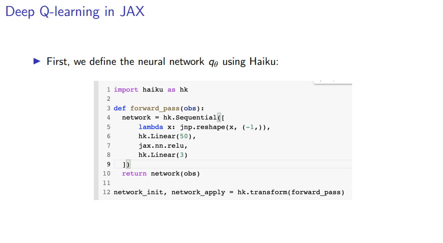 To conclude the introduction, I want to show a very simple example of implementing a basic Q-learning agent that uses a neural network as a function approximator using an Autodiff tool from JAX. So what does such a deep Q-learning agent look like.