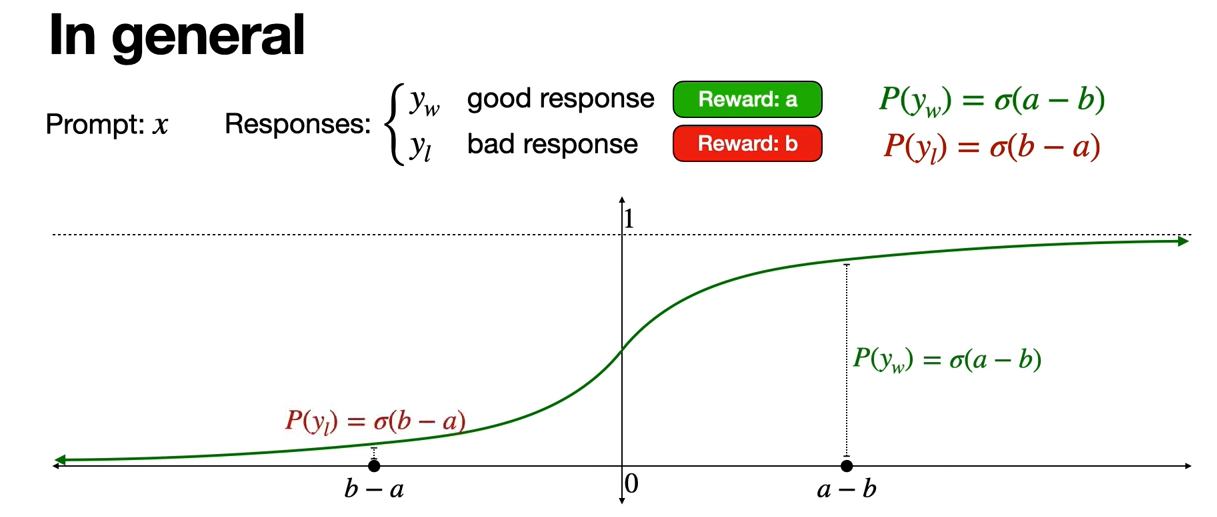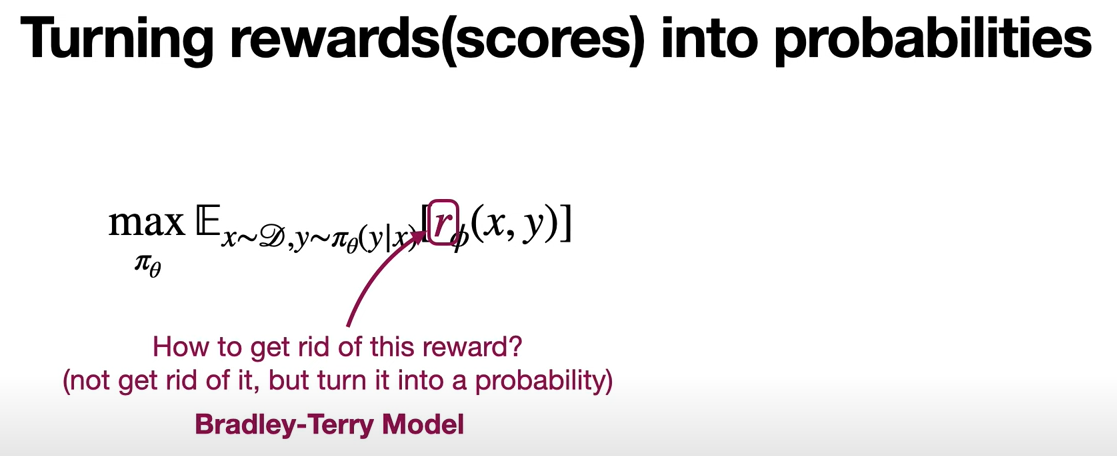 What we want is to get rid of the reward, not get rid of it, but we want to turn it into a probability. So that the loss function only has probabilities, and not rewards. How do we do that? Using something called the Bradley-Terry Model.