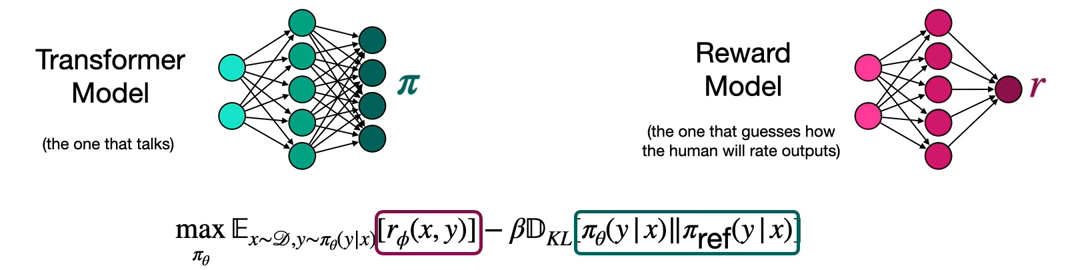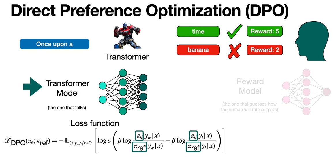 What Direct Preference Optimization does is, it only worries about one neural network that Transformer model. And it kind of doesn't use the reward model, so I'm kind of lying because it doesn't fully forget it. It actually embeds the reward function inside the Transformer model loss function.