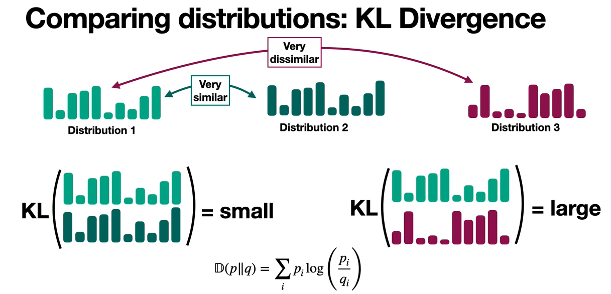 KL Divergence is a way to compare distributions. What KL Divergence does is, it takes a pair of distributions and returns a small number if they're very similar and a large number if they're very different.
