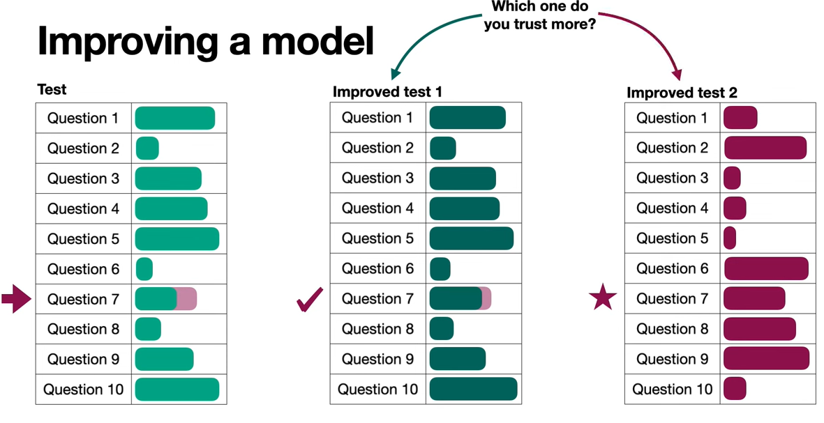 The first time, our friend did really well. They fixed question 7, but they changed some responses. So now here is a question. Which one of the tests would you trust more? I would go for improved test 1, because even though the test 2 did much better in question 7, it changed everything so much that it may not be trustable.