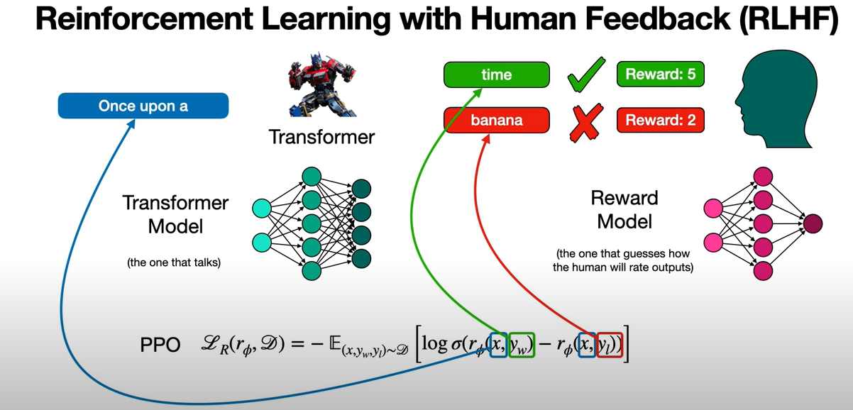 We have the Reinforcement Learning with Human Feedback which used two models. The Transformer model which is the policy model and the reward model which is the one that guesses the response from the human evaluator.