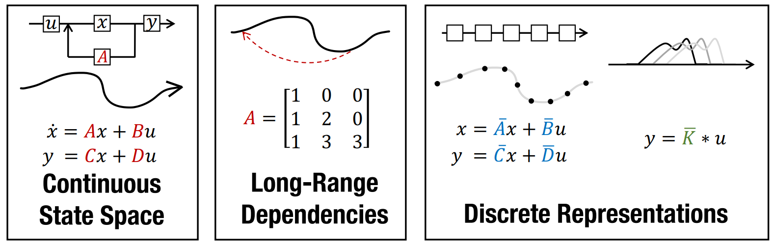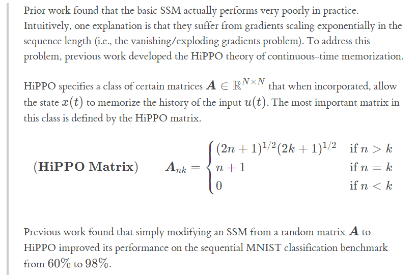 To set the stage, recall that S4 has two main differences from a basic SSM. The first addresses a modeling challenge - long-range dependencies - by using a special formula for the matrix defined in the previous part. These special SSMs were considered in predecessor works to S4.