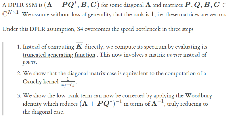 A secondary benefit of the DPLR factorization is that it allows us to compute the discretized form of the SSM without having to invert the A matrix directly. Here we return to the paper for the derivation.