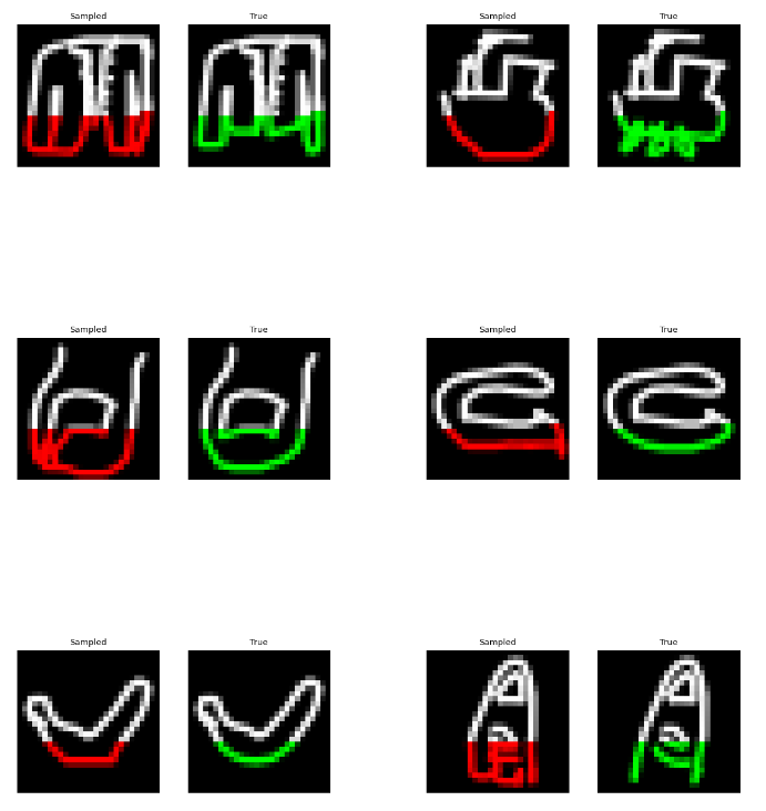 Next we tried training a model to generate drawings. For this we used the QuickDraw dataset. The dataset includes a version of the dataset downsampled to MNIST size so we can use roughly the same model as above. The dataset is much larger though (5M images) and more complex. We only trained for 1 epoch with a H=256, 4 layer model. Still, the approach was able to generate relatively coherent completions. These are prefix samples with 500 pixels given.