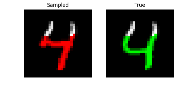def sample_image_prefix( params, model, # length, rng, dataloader, prefix=300, # bsz=32, imshape=(28, 28), n_batches=None, save=True, ): """Sample a grayscale image represented as intensities in [0, 255]""" import matplotlib.pyplot as plt import numpy as onp # from .data import Datasets # BATCH = bsz # start = np.zeros((BATCH, length), dtype=int) # start = np.zeros((BATCH, length, 1), dtype=int) start = np.array(next(iter(dataloader))[0].numpy()) start = np.zeros_like(start) # params, prime, cache = init_recurrence(model, params, start[:, :-1], rng) params, prime, cache = init_recurrence(model, params, start, rng) BATCH = start.shape[0] START = prefix LENGTH = start.shape[1] assert LENGTH == onp.prod(imshape) # _, dataloader, _, _, _ = Datasets["mnist"](bsz=BATCH) it = iter(dataloader) for j, im in enumerate(it): if n_batches is not None and j >= n_batches: break image = im[0].numpy() image = np.pad( image[:, :-1, :], [(0, 0), (1, 0), (0, 0)], constant_values=0 ) cur = onp.array(image) # cur[:, START + 1 :, 0] = 0 # cur = np.pad(cur[:, :-1, 0], [(0, 0), (1, 0)], constant_values=256) cur = np.array(cur[:, :]) # Cache the first `start` inputs. out, vars = model.apply( {"params": params, "prime": prime, "cache": cache}, cur[:, np.arange(0, START)], mutable=["cache"], ) cache = vars["cache"].unfreeze() out = sample(model, params, prime, cache, cur, START, LENGTH - 1, rng) # Visualization out = out.reshape(BATCH, *imshape) final = onp.zeros((BATCH, *imshape, 3)) final2 = onp.zeros((BATCH, *imshape, 3)) final[:, :, :, 0] = out f = final.reshape(BATCH, LENGTH, 3) i = image.reshape(BATCH, LENGTH) f[:, :START, 1] = i[:, :START] f[:, :START, 2] = i[:, :START] f = final2.reshape(BATCH, LENGTH, 3) f[:, :, 1] = i f[:, :START, 0] = i[:, :START] f[:, :START, 2] = i[:, :START] if save: for k in range(BATCH): fig, (ax1, ax2) = plt.subplots(ncols=2) ax1.set_title("Sampled") ax1.imshow(final[k] / 256.0) ax2.set_title("True") ax1.axis("off") ax2.axis("off") ax2.imshow(final2[k] / 256.0) fig.savefig("im%d.%d.png" % (j, k)) plt.close() print(f"Sampled batch {j} image {k}") return final, final2