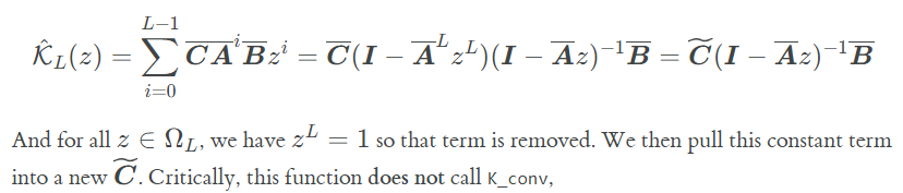 def K_gen_simple(Ab, Bb, Cb, L): K = K_conv(Ab, Bb, Cb, L) def gen(z): return np.sum(K * (z ** np.arange(L))) return gen