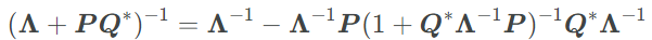 The Woodbury identity tells us that the inverse of a diagonal plus rank-1 term is equal to the inverse of the diagonal plus a rank-1 term. We write it out here adding the low-rank term.