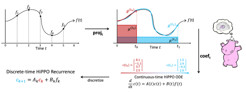 This matrix is going to be really important, but it is a bit of magic. For our purposes we mainly need to know that: 1) we only need to calculate it once, and 2) it has a nice, simple structure (which we will exploit in part 2). Without going into the ODE math, the main takeaway is that this matrix aims to compress the past history into a state that has enough information to approximately reconstruct the history.