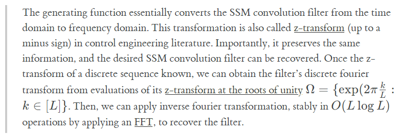 def test_gen_inverse(L=16, N=4): ssm = random_SSM(rng, N) ssm = discretize(*ssm, 1.0 / L) b = K_conv(*ssm, L=L) a = conv_from_gen(K_gen_inverse(*ssm, L=L), L) assert np.allclose(a, b)In summary, Step 1 allows us to replace the matrix power with an inverse by utilizing a truncated generating function. However this inverse still needs to be calculated L times (for each of the roots of unity).