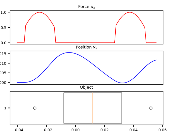 def example_ssm(): # SSM ssm = example_mass(k=40, b=5, m=1) # L samples of u(t). L = 100 step = 1.0 / L ks = np.arange(L) u = example_force(ks * step) # Approximation of y(t). y = run_SSM(*ssm, u) # Plotting --- import matplotlib.pyplot as plt import seaborn from celluloid import Camera seaborn.set_context("paper") fig, (ax1, ax2, ax3) = plt.subplots(3) camera = Camera(fig) ax1.set_title("Force $u_k$") ax2.set_title("Position $y_k$") ax3.set_title("Object") ax1.set_xticks([], []) ax2.set_xticks([], []) # Animate plot over time for k in range(0, L, 2): ax1.plot(ks[:k], u[:k], color="red") ax2.plot(ks[:k], y[:k], color="blue") ax3.boxplot( [[y[k, 0] - 0.04, y[k, 0], y[k, 0] + 0.04]], showcaps=False, whis=False, vert=False, widths=10, ) camera.snap() anim = camera.animate() anim.save("images/line.gif", dpi=150, writer="imagemagick")if False: example_ssm()