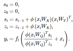 "In our paper, we show that replacing the softmax attention with a linear dot product of kernel feature maps ϕ(Q) and ϕ(K) allows us to express any transformer as a recurrent neural network with the following update equations, where xi denotes the i-th input, yi the i-th output and si, zi the hidden state at timestep i" (https://linear-transformers.com/)