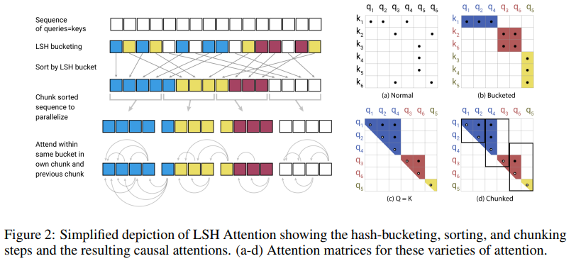 For LSH attention, we have to use identical queries and keys. We map each query to a bucket by applying the LSH function. After mapping all the queries to the buckets, we define the connectivity patterns based on these buckets. After obtaining the buckets, we sort these buckets and create chunks of equal size.