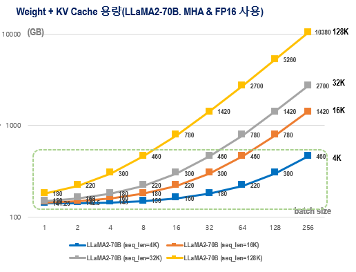 LLaMA2의 모델 버전별 KV cache 메모리 요구량(FP16기준. by author) 아래 그림은 LLaMA2-70B가 MHA를 사용하였을 때 sequence length와 batch size별 KV cache의 메모리 요구량의 변화를 나타낸 것이다. LLaMA2는 기본적으로 sequence length=4K를 지원하므로 batch 당 KV cache의 메모리 요구량은 1.25GB인 것을 알 수 있다. 만일 LLaMA2의 sequence length를 128K로 증가시킨다면 KV cache를 위해 batch당 무려 40GB가 필요하다!! 특히 long context 조건에서 KV cache의 메모리 요구량은 batch size에 비례하여 급격하게 증가함을 알 수 있다. 예를들어 sequence length=128K & batch size=32인 경우 KV cache는 1TB이 넘는 것을 알 수 있다.
