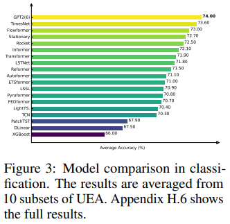 As shown in Figure 3, GPT2(6) FPT achieves an average accuracy of 74.00%, surpassing all baselines including TimesNet (73.60%). Specifically, compared to recent published patch-transformer-based models Nie et al. (2022) , GPT2(6) FPT surpasses it by a large margin 9.0% which shows the prior NLP transfer knowledge can indeed help in time series representation.