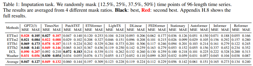 The results are shown in Table 1 that GPT2(3) FPT achieves the best performance on most datasets. Particularly, compared to the previous SOTA TimesNet, GPT2(3) FPT yields a relative 11.5% MSE reduction on ETTh1,and a 4.1% MSE reduction on average on six benchmark datasets. It verifies that the proposed method can also effectively mine temporal patterns of incomplete time series.