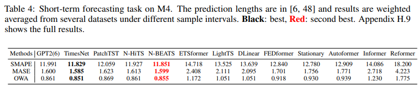 The results in Table 4 show that the performance of GPT2-backbone (6) FPT is superior to advanced Transformer-based and MLP-based models, and comparable to TimesNet and N-BEATS.