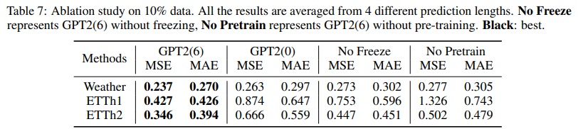 The results are shown in Table 7, GPT2(6) FPT outperforms both GPT2(0) FPT and GPT2-random-initialized, suggesting that GPT2 with pre-training parameters can achieve improvement on times series tasks. Besides, GPT2(6) FPT performs better than GPT2- unfrozen, demonstrating that partially freezing also helps. Also, results in Appendix H.2 show that random initialized GPT2(6) with freezing performs poorly and the pre-trained knowledge is instrumental for time series tasks.