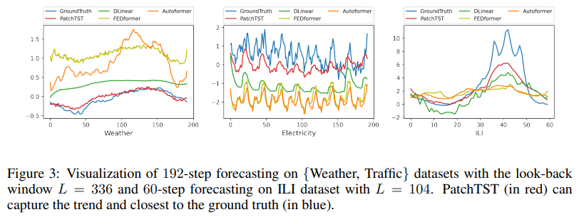 We visualize the long-term forecasting results of supervised PatchTST/42 and other baselines in Figure 3. Here, we predict 192 steps ahead on Weather and Eletricity datasets and 60 steps ahead on ILI dataset. PatchTST provides the best forecasting both in terms of scale and bias.