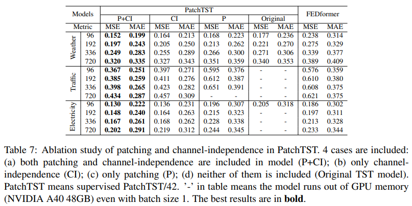 Implementation Details. For ablation study on patching and channel independence in section 4.3, we run different variants of PatchTST: