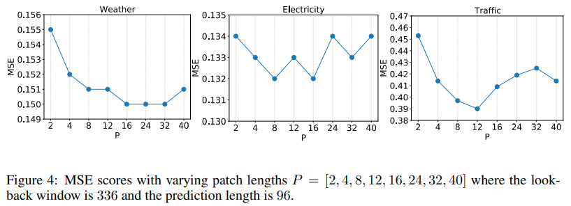 This experiment studies the effect of patch lengths to the forecasting performance. We fix the lookback window to be 336 and vary the patch lengths P = [4, 8, 16, 24, 32, 40]. The stride length is set the same as patch length, meaning no overlapping between patches. The model is trained to predict 96 steps. One observation from Figure 4 is that MSE scores don’t vary significantly with different choices of P, which indicate the robustness of our model against the patch length hyperparameter. Overall, PatchTST benefits from increased patch length, not only in forecasting performance but also in the computational reduction. The ideal patch length may depend on the dataset, but P between {8, 16} seems to be general good numbers.