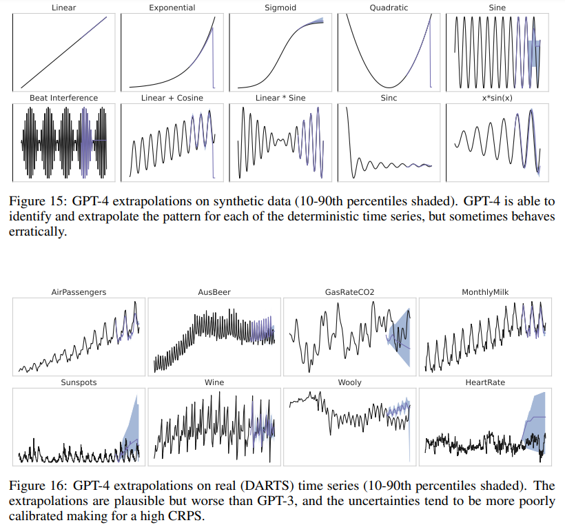 We investigated using GPT-4 for time series prediction. Due to the limitations of the tokenizer, we used the naive tokenization strategy of feeding in the numbers without additional spaces. In addition, due to the enforced separation between system and user in the interface (through additional tokens we cannot modify), inputting the time series input alone leads GPT-4 to talk about the time series or provide analysis, rather than simply continuing the stream of numbers. In order to coax GPT-4 to produce numerical predictions which can be decoded, we added the additional commands System: "You are a helpful assistant that performs time series predictions. The user will provide a sequence and you will predict the remaining sequence. The sequence is represented by decimal strings separated by commas." User: "Please continue the following sequence without producing any additional text. Do not say anything like ’the next terms in the sequence are’, just return the numbers. Sequence:". We found that doing so was sufficient to be able to consistently decode the output numerically for GPT-4, but not for GPT-3.5-turbo.