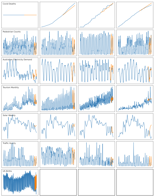 • Monash [19]: The Monash forecasting archive contains 30 publicly available datasets along with baseline numbers for 12 forecasting models, including simple exponential smooth (e.g. ETS [27]), gradient boosting (e.g. CatBoost [40]) and deep learning models (e.g. DeepAR [41], WaveNet [36]). The Monash archive comprises over 400,000 individual time series, making it infeasible to use in its entirety with the largest available LLMs. To reduce the computational burden, we evaluate GPT-3’s zero-shot performance on 19 datasets described in Appendix C.2.