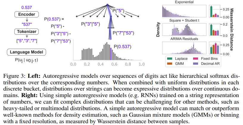 The fact that LLMs can express flexible distributions over numbers is key for time series data. Uncertainty quantification is essential to forecasting, and typical approaches to representing uncertainty in time series can be limited by misspecification. For example, one common method for creating a probabilistic forecast is to fit a Gaussian or Laplace observation model. When the underlying data distribution is multimodal, both of these models will perform poorly. Methods like Gaussian mixture models (GMMs) solve the issue of multimodality but introduce additional challenges to optimization and model selection. We show that a language model is an underrated solution by training a small autoregressive model on a variety of one-dimensional distributions shown in Figure 3 (right). These distributions come from an exponential random variable, a mixture of a uniform and a student-t distribution, and the heavy-tailed distribution of time series prediction residuals from an ARIMA model on the MonthlyMilk dataset [24]. We evaluate these fits quantitatively by computing Wasserstein distances, and compare to a Laplace observation model, a GMM trained with expectation-maximization, and logistic regression over a flat binning of the data (with a tuned bin size). Each model is trained with only 200 samples from the distribution. The results show that the decimal autoregressive language model (“Decimal AR”) performs extremely well, handling asymmetric, multimodal, and heavy-tailed distributions, which are among the diverse types characteristic of time series data.