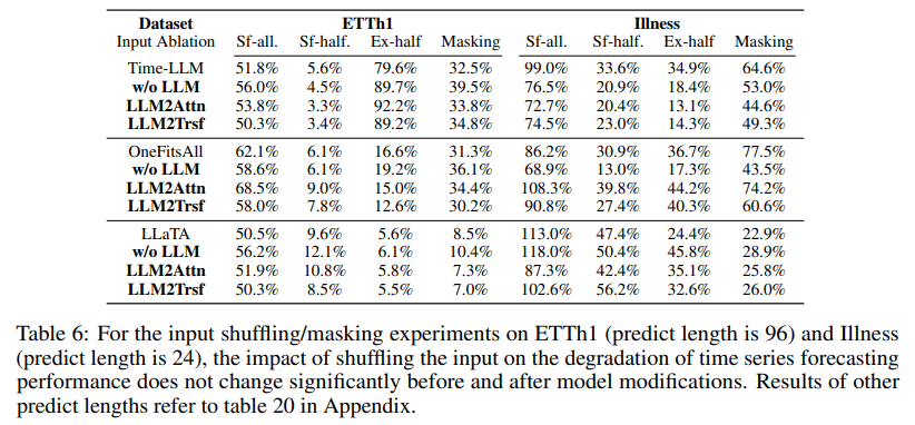 Most time series forecasting methods that use LLMs finetune the positional encoding to help understand the position of time steps in the sequence [4, 42, 19, 5, 29]. We would expect a time series model with good positional representations to show a significant drop in predictive performance when the input is shuffled [38]. We applied three types of shuffling to the time series: shuffling the entire sequence randomly ("sf-all"), shuffling only the first half of the sequence ("sf-half"), and swapping the first and second halves of the sequence ("ex-half"). As shown in Table 6, LLM-based methods were no more vulnerable to input shuffling than their ablations. This implies that LLMs do not have unique capabilities for representing sequential dependencies in time series.
