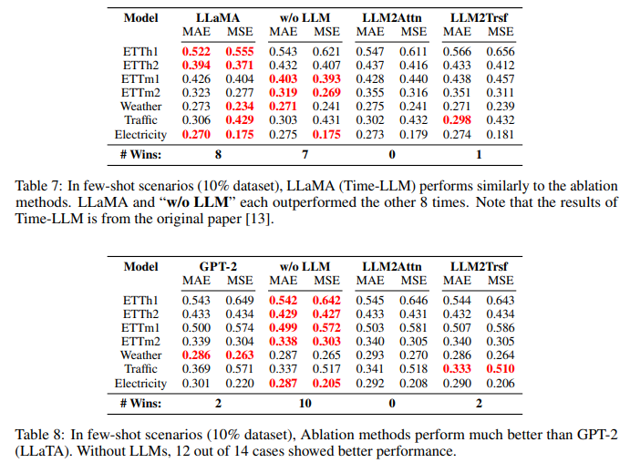 While our results indicate that LLMs are not useful for time series forecasting, it is nonetheless possible that knowledge encoded in pretrained weights could help performance in few-shot settings where data are scarce. To evaluate whether this is the case we trained models and their ablations on 10% of each dataset. Specifically, we evaluated LLaMA in Time-LLM methods. The results for LLaMA, shown in Table 7, compared LLaMA with completely removing the LLM (w/o LLM). There was no difference, with each performing better in 8 cases. We conducted similar experiments with LLaTA, a GPT-2-based method. Our results in Table 8 indicate that our ablations can perform better than LLMs in few-shot scenarios.