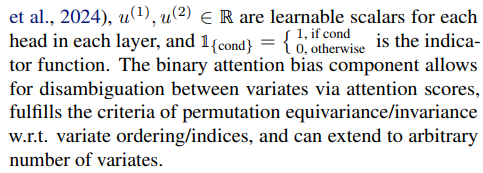 Universal forecasters must be equipped to handle arbitrary multivariate time series. Existing time series Transformers often rely on an independent variate assumption or are limited to a single dimensionality due to embedding layers mapping R dy → R dh , where R dh is the hidden dimension. We overcome this limitation as shown in Figure 2, by flattening a multivariate time series to consider all variates as a single sequence. This introduces a new requirement of having variate encodings to enable the model to disambiguate between different variates in the sequence. Furthermore, we need to ensure that permutation equivariance w.r.t. variate ordering, and permutation invariance w.r.t. variate indices are respected. Conventional approaches like sinusoidal or learned embeddings do not meet these requirements, and are unable to handle an arbitrary number of variates. To address this, we propose Any-variate Attention, leveraging binary attention biases to encode variate indices.