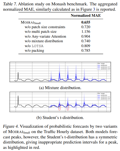 We perform a series of ablations in Table 7, starting from the default MOIRAISmall. Firstly, we ablate the multi patch size component, removing the constraints by allowing any frequency to have any patch size during training, and also simply fixing the patch size to 32. In both cases, we observe a deterioration in normalized MAE. Removing Any-variate Attention and using additive learned embeddings (randomizing variate index during training to encourage permutation invariance) instead, leads to suboptimal results, showcasing the strength of Any-variate Attention. We see similar deterioration when replacing the mixture distribution with a Student’s t-distribution, and further visualize the necessity of flexible distributions for probabilistic forecasts in Figure 4.