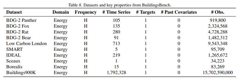 BuildingsBench (Emami et al., 2023) (Table 8) provides a collection of datasets for residential and commercial building energy consumption. The BDG-2 datasets, Low Carbon London, SMART, IDEAL, Sceaux, and Borealis are real building energy consumption datasets from various sources. The Electricity dataset (Trindade, 2015) is also included in BuildingsBench but we omit it from LOTSA and use it for out-of-distribution evaluation instead. They further release the Buildings-900K dataset a large-scale dataset of 900K simulated buildings. Emami et al. (2023) introduce a pre-train/test split based on Public Use Microdata Area, but we use include both splits in LOTSA for pre-training. No special pre-processing was applied to these datasets. More information regarding these datasets can be found in Emami et al. (2023).