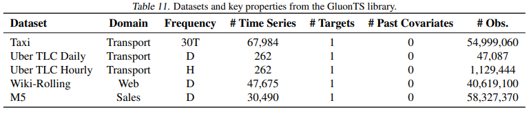 The GluonTS library (Alexandrov et al., 2020) provides many datasets popularly used in time series forecasting. We only include the datasets presented in Table 11 as we either hold out the other datasets, or are already included in the Monash repository.