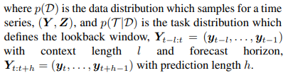 Different from the existing deep forecasting paradigm, we aim to train a model with forecasting capabilities over varying context and prediction lengths. Rather than defining a fixed context and prediction length, we sample from a task distribution, (t, l, h) ∼ p(T |D) which defines the lookback window and forecasting horizon, given a time series. In practice, rather than sampling t, l, h, given a time series, we crop a uniformly sampled window, whose length is uniformly sampled from a range. This range is defined by a minimum sequence length per variate of 2, and a total maximum sequence length of 512. The window is then split into lookback and horizon segments, where the prediction length is uniformly sampled as a proportion (within the range [0.15, 0.5]) of the window. We further augment training by i) uniformly subsampling multivariate time series in the variate dimension, and ii) constructing multivariate time series from sub-datasets with univariate time series, by randomly concatenating them. The number of variates is sampled from a beta-binomial distribution with parameters n = 128, a = 2, b = 5 which supports a maximum of 128 variates, with mean ≈ 37 for efficiency.
