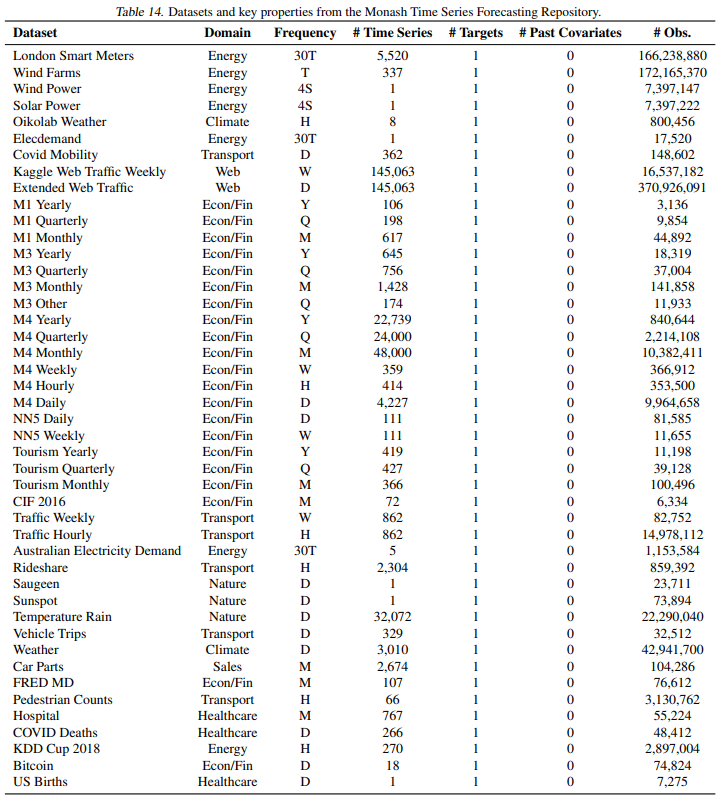 The Monash Time Series Forecasting Repository (Godahewa et al., 2021) (Table 14) is a large collection of diverse time series datasets, the most popular source for building LTMs. We use Monash for in-distribution evaluation, and thus apart from the exceptions listed below, we only include the train region in LOTSA, by holding out the final forecast horizon as the test set. The final forecast horizon is defined for each dataset by (Godahewa et al., 2021). For the following datasets, we include their entirety in LOTSA without a held-out test set for the following reasons: