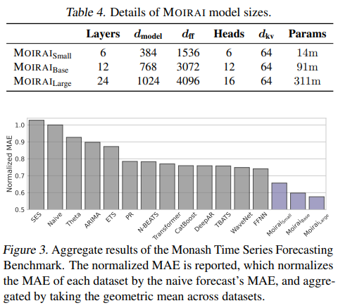 To power the training of our Large Time Series Model (LTM), we introduce the Large-scale Open Time Series Archive (LOTSA), the largest collection of open time series datasets with 27B observations across nine domains. We optimize the negative log-likelihood of the mixture distribution, and randomly sample context and prediction lengths during training, allowing for flexible downstream usage of the pre-trained model. We train our proposed method, Masked EncOder-based UnIveRsAl TIme Series Forecasting Transformer (MOIRAI1 ), in three sizes – MOIRAI_Small, MOIRAI_Base, and MOIRAI_Large, with 14m, 91m, and 311m parameters respectively. We perform experimental evaluations on both in and out-of-distribution settings, and show that MOIRAI consistently achieves competitive or superior performance compared to state-of-the-art full-shot baselines. Our contributions are summarized as follows: