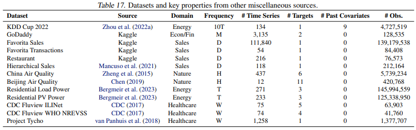Finally, detailed in Table 17, we further collect datasets from miscellaneous sources not provided by a library or collection. These datasets require more extensive pre-processing since they are not provided by a library, and are raw data instead. We take a standard approach of filtering out time series which are either too short, or have too many missing values. Fo each time series, we consider all variates to be targets, unless otherwise specified by the creators of the dataset (e.g. KDD Cup 2022 is a competition dataset, for which only the “Patv” variate is defined to be the target, with 9 other covariates)