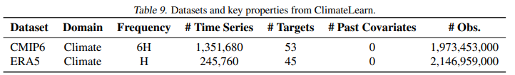 We include the ERA5 and CMIP6 datasets from the ClimateLearn library (Nguyen et al., 2023) (Table 9). The ERA5 and CMIP6 datasets provide time series of various climate related variables such as temperature, and humidity and various pressure levels, based on a grid structure. We use the 2.8125◦ resolution which contains time series in a 64×128 grid.
