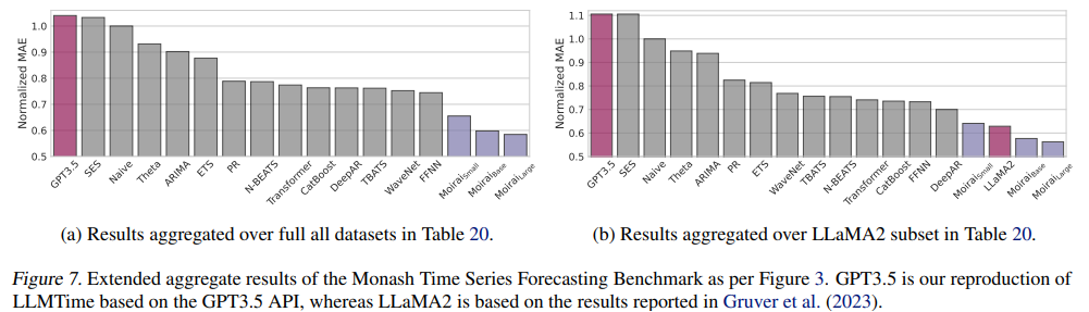 We include the full breakdown of results for the Monash benchmark in Table 20, including two versions of LLMTime: GPT3.5 (our reproduction), and LLaMA2 (results from Gruver et al. (2023)). GPT3.5 is our reproduction by running their code5 on the full dataset, using GPT3.5-Turbo-Instruct since text-davinci-003 has been deprecated. LLaMA2 only has results for a subset of datasets in Table 20, thus in Figure 7, we present two aggregated results, one aggregated on the full Table 20, and one on the subset with results available for LLaMA2. As observed, MOIRAI retains the top rankings for with the base and large models in all settings.