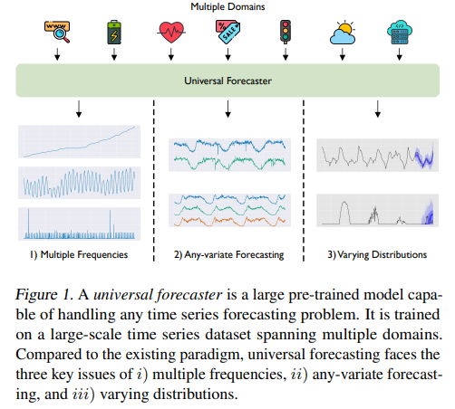 In the era of foundation models (FMs) (Bommasani et al., 2021), the landscape of deep learning for time series forecasting is experiencing a revolution. In contrast to FMs capable of tackling a multitude of downstream tasks, the current deep forecasting paradigm, involving training a model on a single dataset with a fixed context and prediction length, appears increasingly antiquated, lacking the capacity to generalize or adapt to diverse scenarios or datasets. Given the unreasonable effectiveness of large pre-trained models in improving performance and data efficiency via transfer learning in modalities like vision and language (Dosovitskiy et al., 2020; Brown et al., 2020), we are starting to see a push to transition away from the existing paradigm, towards a universal forecasting paradigm (see Figure 1), where a single large pre-trained model is able to handle any time series forecasting problem. However, the road to building a universal time series forecasting model is mired with challenges.