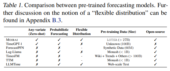 Table 1 provides a summary of the key differences between recent pre-trained models with zero-shot forecasting capabilities, which is a recently emerging field. TimeGPT-1 (Garza & MergenthalerCanseco, 2023) first presented a closed-source model, offering zero-shot forecasting capabilities as well as supporting fine-tuning through an API, currently only available to their beta users. ForecastPFN (Dooley et al., 2023) proposes to pre-train on synthetic time series, which can be subsequently be leveraged as a zero-shot forecaster, albeit specialized for data or time limited settings. Lag-llama (Rasul et al., 2023) works towards a foundation model for time series forecasting, leveraging the LLaMA (Touvron et al., 2023) architecture design with lagged time series features, and also presents neural scaling laws for time series forecasting. TimesFM (Das et al., 2023b) is a patch-based decoder-only foundation model for time series forecasting, introducing a larger output patch size for faster decoding. They collected a massive amount of data from Google Trends and Wiki pageviews to pre-train their model in combination with opendata. Tiny Time Mixers (TTMs) (Ekambaram et al., 2024) is a concurrent work leveraging lightweight mixer-style architecture. They perform data augmentation by downsampling high-frequency time series, and support multivariate downstream tasks by fine-tuning an exogenous mixer. leverage Large Language Models (LLMs), pre-trained on web-scale text data, have been leveraged for zero-shot forecasting. Specifically, LLMTime (Gruver et al., 2023) treats time series as strings, applying careful pre-processing based on the specific LLMs’ tokenizer, showing that LLMs have the inherent capability to perform zero-shot forecasting.