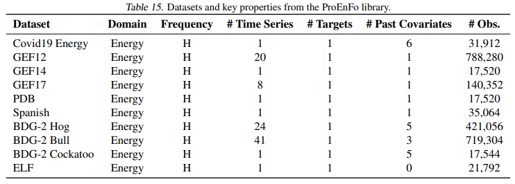 ProEnFo (Wang et al., 2023b) (Table 15) provides a range of datasets for load forecasting. Unlike BuildingsBench, ProEnFo provides various covariates such as temperature, humidity, and wind speed. We again omit Electricity (Trindade, 2015) which is originally included in ProEnFo for out-of-distribution evaluations.