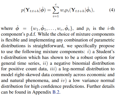 Starting from a masked encoder architecture which has been shown to be a strong candidate architecture for scaling up pre-trained time series forecasting models (Woo et al., 2023), we alleviate the above issues by introducing novel modifications which allows the architecture to handle the heterogeneity of arbitrary time series data. Firstly, we propose to learn multiple input and output projection layers to handle the differing patterns from time series of varying frequencies. Using patch-based projections with larger patch sizes for high-frequency data and vice versa, projection layers are specialized to learn the patterns of that frequency. Secondly, we address the problem of varying dimensionality with our proposed Any-variate Attention, which simultaneously considers both time and variate axes as a single sequence, leveraging Rotary Position Embeddings (RoPE) (Su et al., 2024), and learned binary attention biases (Yang et al., 2022b) to encode time and variate axes respectively. Importantly, Any-variate Attention allows the model to take as input arbitrary number of variates. Thirdly, we overcome the issue of requiring flexible predictive distributions with a mixture of parametric distributions. Furthermore, optimizing the negative log-likelihood of a flexible distribution has the added benefit of being competitive with target metric optimization (Awasthi et al., 2022), a powerful feature for pre-training universal forecasters, given that it can be evaluated with any target metric subsequently.