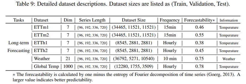 We evaluate the performance of various models for long-term forecasting across eight well-established datasets, including the Weather (Wu et al., 2021), Global Temp (Wu et al., 2023b), and ETT datasets (ETTh1, ETTh2, ETTm1, ETTm2) (Zhou et al., 2021). A detailed description of each dataset is provided in Table 9.