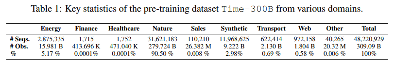 Training time series foundation models require extensive, high-quality data. However, well-processed large-scale datasets are still relatively scarce. Recent advancements have facilitated the collection of numerous time series datasets from various sources (Godahewa et al., 2021; Ansari et al., 2024; Woo et al., 2024; Liu et al., 2024b). Nonetheless, data quality still remains a challenge, with prevalent issues such as missing values and invalid observations (Wang et al., 2024a) that can impair model performance and destabilize training. To mitigate these issues, we developed a streamlined data-cleaning pipeline (Appendix C) to filter and refine raw data, and constructed the largest open-access, high-quality time series data collection named Time-300B for foundation model pre-training. Time-300B is composed of a diverse range of publicly available datasets, spanning multiple domains such as energy, retail, healthcare, weather, finance, transportation, and web, as well as a portion of synthetic data to enhance the data quantity and diversity. Time-300B covers a wide spectrum of sampling frequencies from seconds to yearly intervals, and has over 300 billion time points after being processed by our data-cleaning pipeline, as summarized in Table 1.