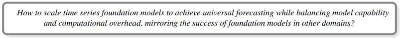 Time series data is a major modality in real-world dynamic systems and applications across various domains (Box et al., 2015; Zhang et al., 2024; Liang et al., 2024). Analyzing time series data is challenging due to its inherent complexity and distribution shifts, yet it is crucial for unlocking insights that enhance predictive analytics and decision-making. As a key task in high demand, time series forecasting has long been studied and is vital for driving various use cases in fields such as energy, climate, education, quantitative finance, and urban computing (Jin et al., 2023; Nie et al., 2024; Mao et al., 2024). Traditionally, forecasting has been performed in a task-specific, end-to-end manner using either statistical or deep learning models. Despite their competitive performance, the field has not converged on building unified, general-purpose forecasting models until recently, with the emergence of a few foundation models (FMs) for universal forecasting (Das et al., 2024; Woo et al., 2024; Ansari et al., 2024). Although promising, they are generally small in scale and have limited task-solving capabilities compared to domain-specific models, limiting their real-world impact when balancing forecasting precision against computational budget.