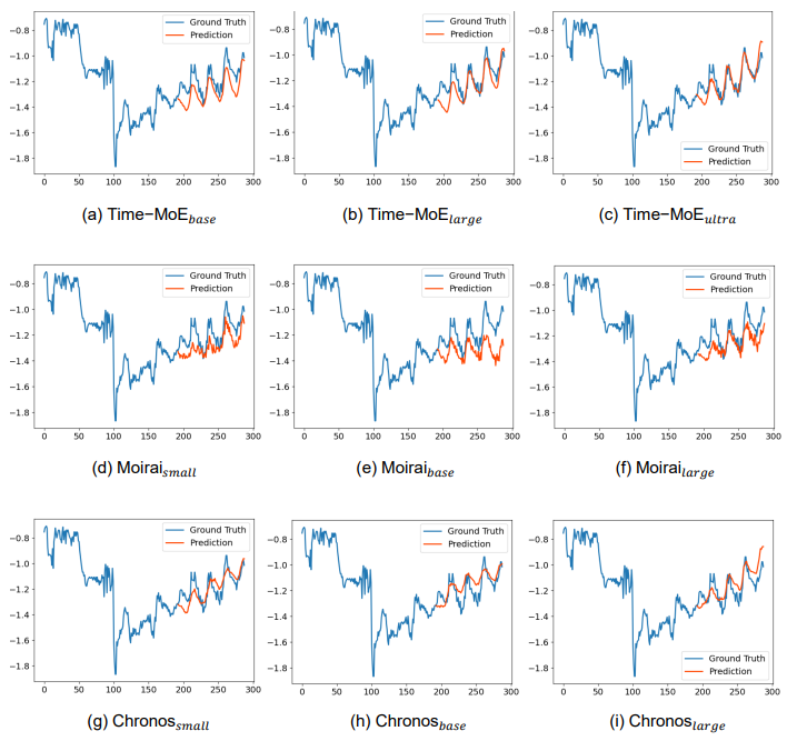 The results clearly demonstrate the superiority of TIME-MOE over the other foundational models. Its ability to consistently produce more accurate forecasts across a range of datasets underscores the effectiveness of its architecture and design. The performance gains are especially noticeable in long-term prediction scenarios, where TIME-MOE’s handling of temporal dependencies proves more robust than its counterparts. These visual comparisons highlight the practical advantages of TIME-MOE in large-scale time series forecasting, reinforcing its status as a state-of-the-art model.