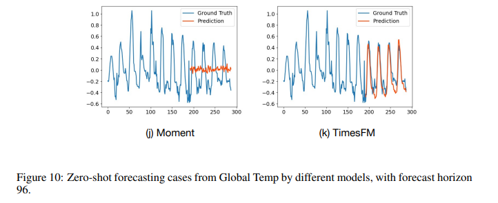 To visualize the performance differences among various large-scale time series models, we present the forecasting results of our model, TIME-MOE, in comparison to the ground truth across six realworld benchmarks. These benchmarks include ETTh1, ETTh2, ETTm1, ETTm2, Weather, and Global Temp datasets. Alongside TIME-MOE’s results, we also show the performance of other large-scale baseline models at different scales, providing a comprehensive view of their comparative capabilities (Figures 5 – 10). In all figures, the context length is set to 512, and the forecast horizon is 96. To enhance clarity and aesthetics, we display the full forecast output, complemented by a portion of the preceding historical input data, ensuring a more intuitive comparison.