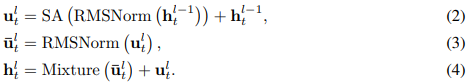 Here, SA denotes self-attention with a causal mask, and Mixture refers to the mixture-of-experts layer. In practice, Mixture comprises several expert networks, each mirroring the architecture of a standard FFN. An individual time series point can be routed to either a single expert (Fedus et al., 2022) or multiple experts (Lepikhin et al., 2020). One expert is designated as a shared expert to capture and consolidate common knowledge across different contexts.